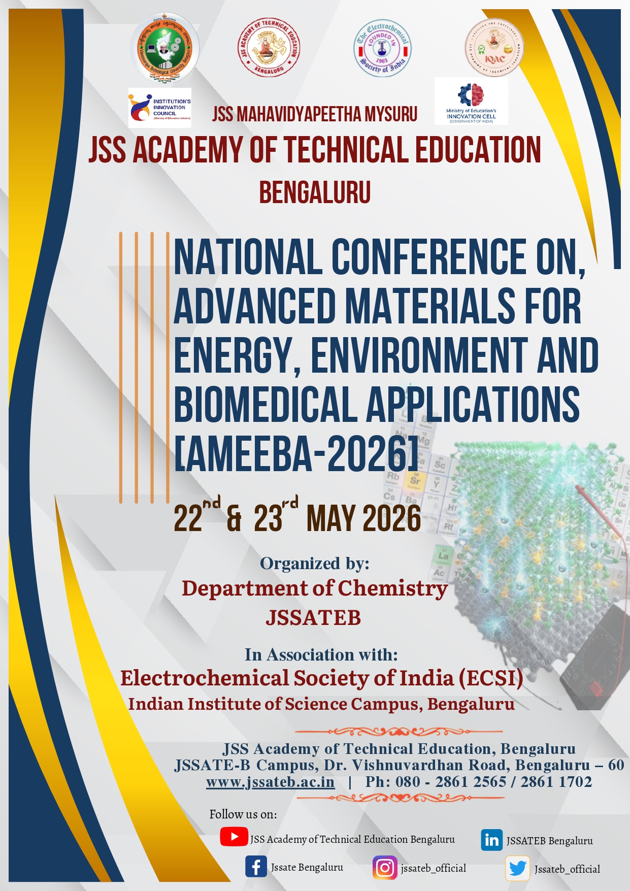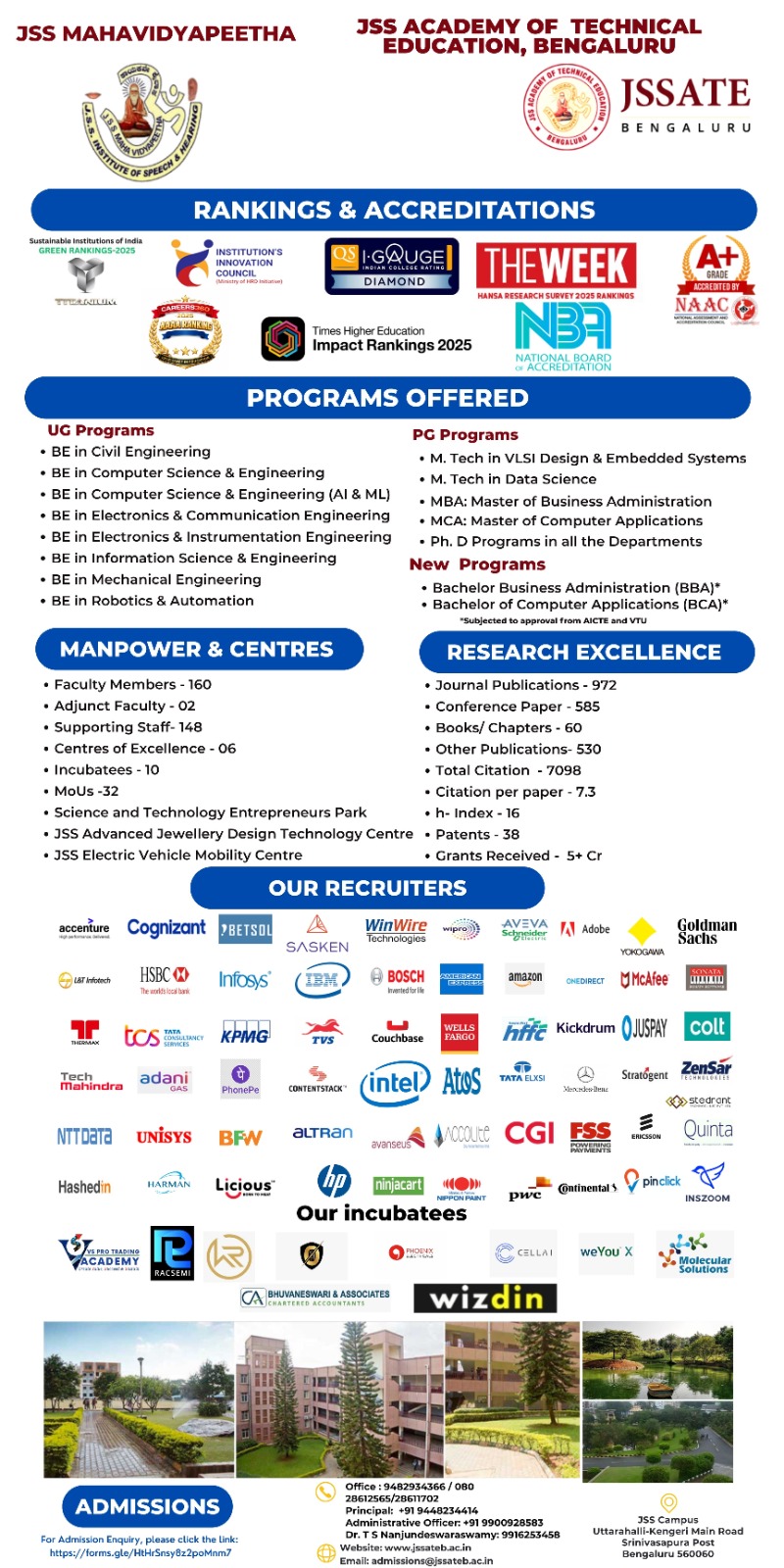 JSSATEB offers BE courses in 8 branches of engineering namely Civil, CSE, CSE(AI&ML),ECE, EIE, ISE,RA and Mechanical Engineering. Six disciplines are accredited from the National Board of Accreditation (NBA), New Delhi.
