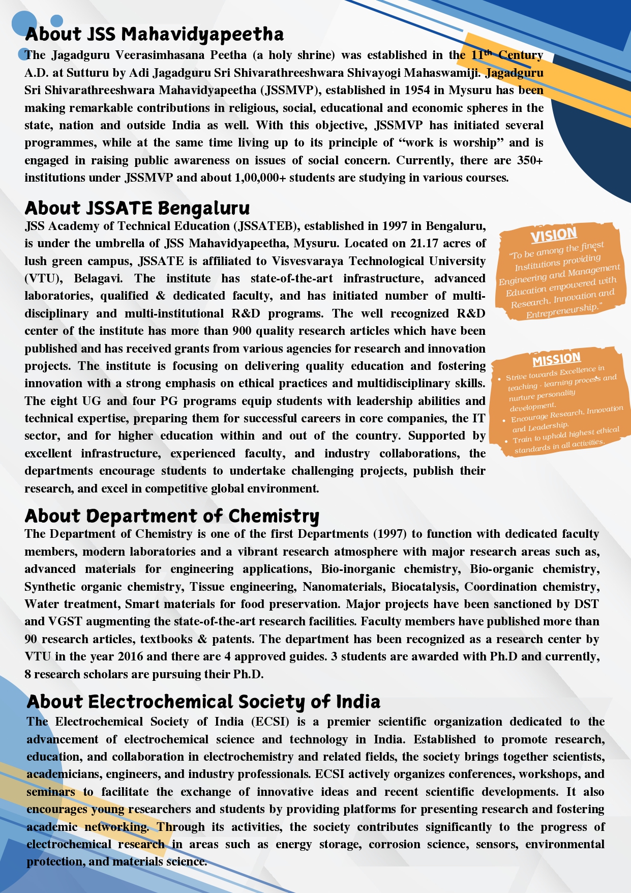 JSS Academy of Technical Education (JSSATE) was established in the year 1997 at Bangalore and is under the umbrella of JSS Mahavidyapeetha, Mysore. JSSATE is the result of the vision of our President, His Holiness Jagadguru Sri Shivarathri Deshikendra Mahaswamiji to proactively participate in establishing a world class Institution for Technical Education. The Campus is located on a sprawling 21.17 acres land surrounded by lush green plantation on the South-Western edge of Bangalore City. The institution is affiliated to Visvesvaraya Technological University (VTU), Belagavi, India.